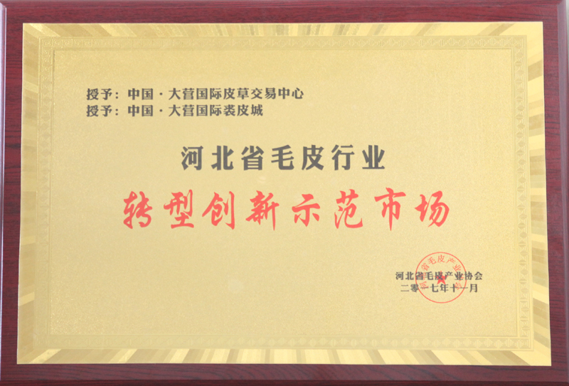 中国·大营国际皮草买卖中心 中国·大营国际裘皮城 荣获 河北省毛皮行业转型创新示范市场